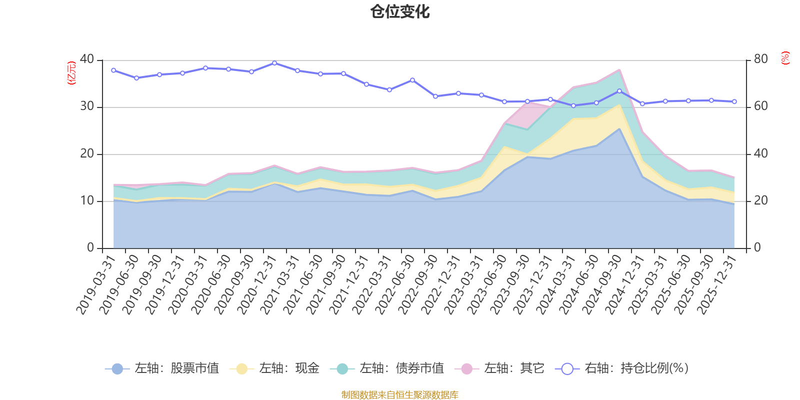 据定期报告数据统计,近三年平均股票仓位为62.84%,同类平均为67.52%。2020年末基金达到78.71%的最高仓位,2024年一季度末最低,为60.59%。