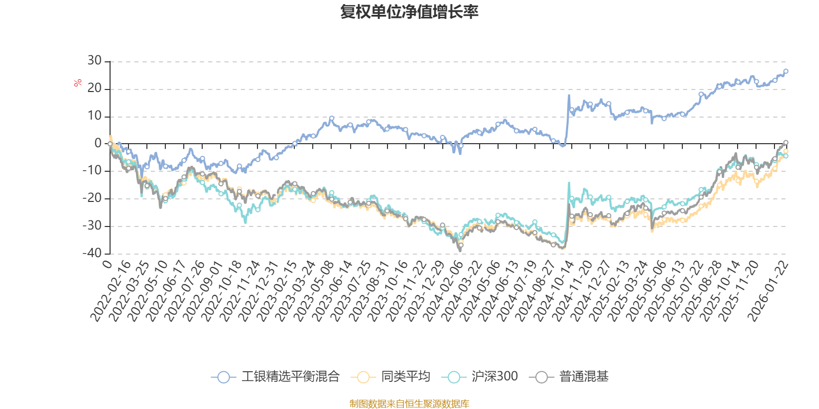 截至1月22日,工银精选平衡混合近三个月复权单位净值增长率为3.42%,位于同类可比基金106/134;近半年复权单位净值增长率为7.08%,位于同类可比基金107/134;近一年复权单位净值增长率为14.92%,位于同类可比基金105/131;近三年复权单位净值增长率为27.95%,位于同类可比基金40/124。