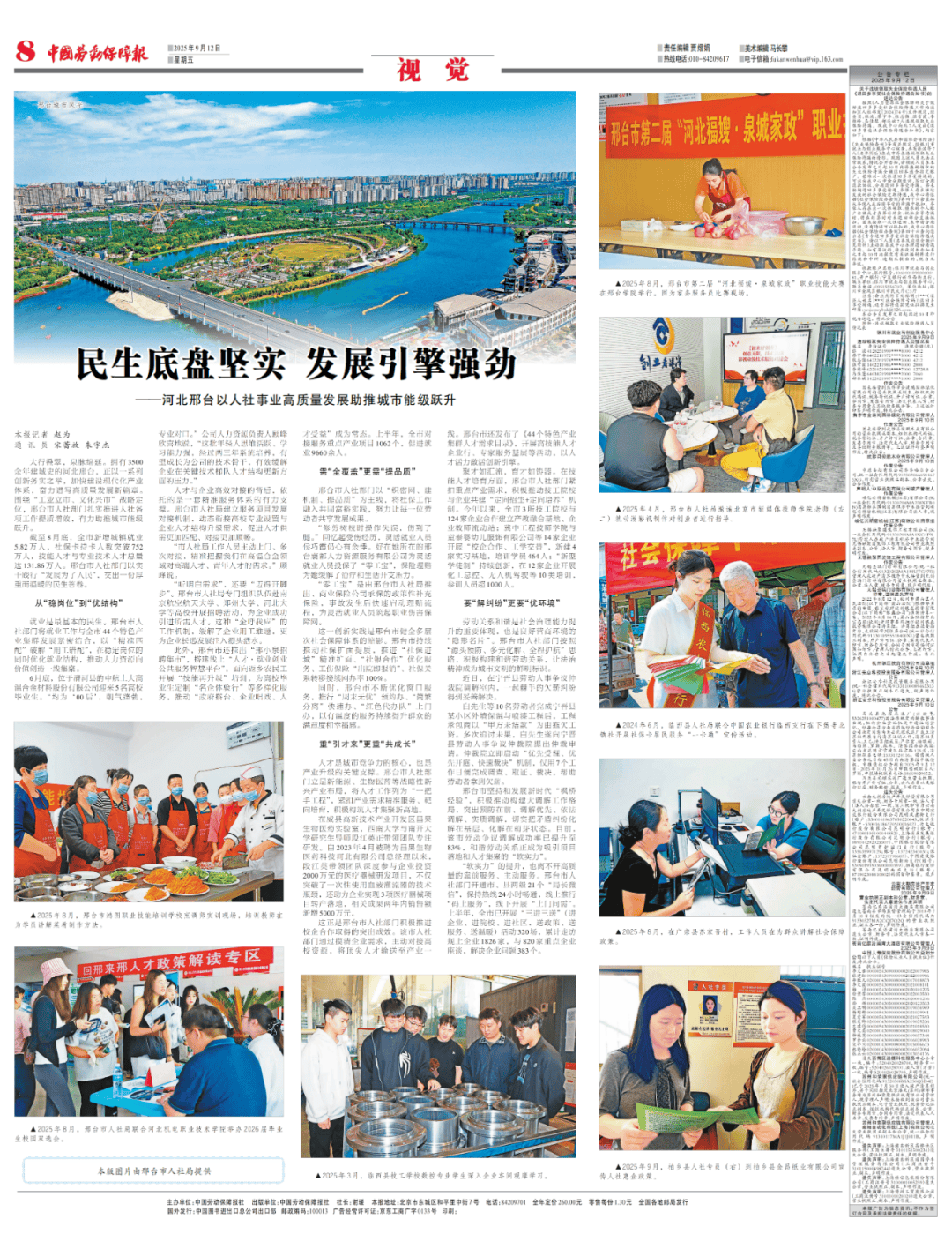 将人才工作作为服务高质量发展的基础工程,实施服务产业发展的引才政策。编制发布《邢台市44个特色产业集群人才需求目录》,覆盖605家单位、1712个岗位、10523个需求,为企业精准引进人才。深化“邢台市人才·就业创业公共服务智慧平台”推广应用,入驻企业、院校2865家,累计发布岗位1.67万余个;与省内院校共建5家“招才引智联络站”,指导邢台技师学院等8家技工院校与54家企业共建产教融合基地、企业教师流动站,获批省级高技能人才培训基地1个、省级技能大师工作室3个;在全国第三届职业技能大赛取得1金、1银、8个优胜奖。全力支持博士后创新发展,1项目在第三届博士后创新创业大赛决赛中荣获优胜奖,成功推荐专家项目资助6人,组织专家深入基层服务群众超10万人次。